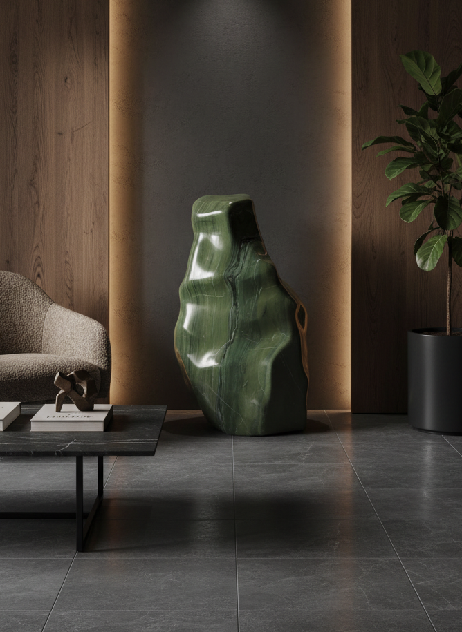 их масштаб и пластика органично работают на террасах, у входных групп и в саду. Полировка даёт мягкий шелковистый блеск и выразительно смотрится при дневном и вечернем свете. Размещайте камень у кромки воды, на гравийной тропе, на деревянной деке или в злаковых посадках — валун собирает композицию и становится тихим фокусом пространства.