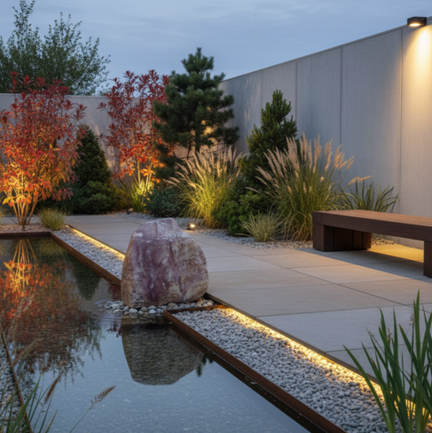 Один выразительный природный акцент собирает композицию, задаёт фокус и баланс. Валун работает как «якорь» взгляда без перегруза декором.